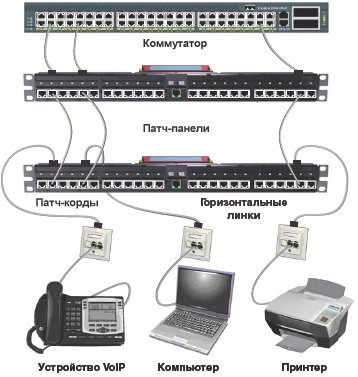 Патч-панель, являясь связующим звеном между кабелем горизонтальной СКС и патч-кордом узла коммутации или распределительного узла обеспечивает соединение на постоянной части кабельной системы — (горизонтальный линк)